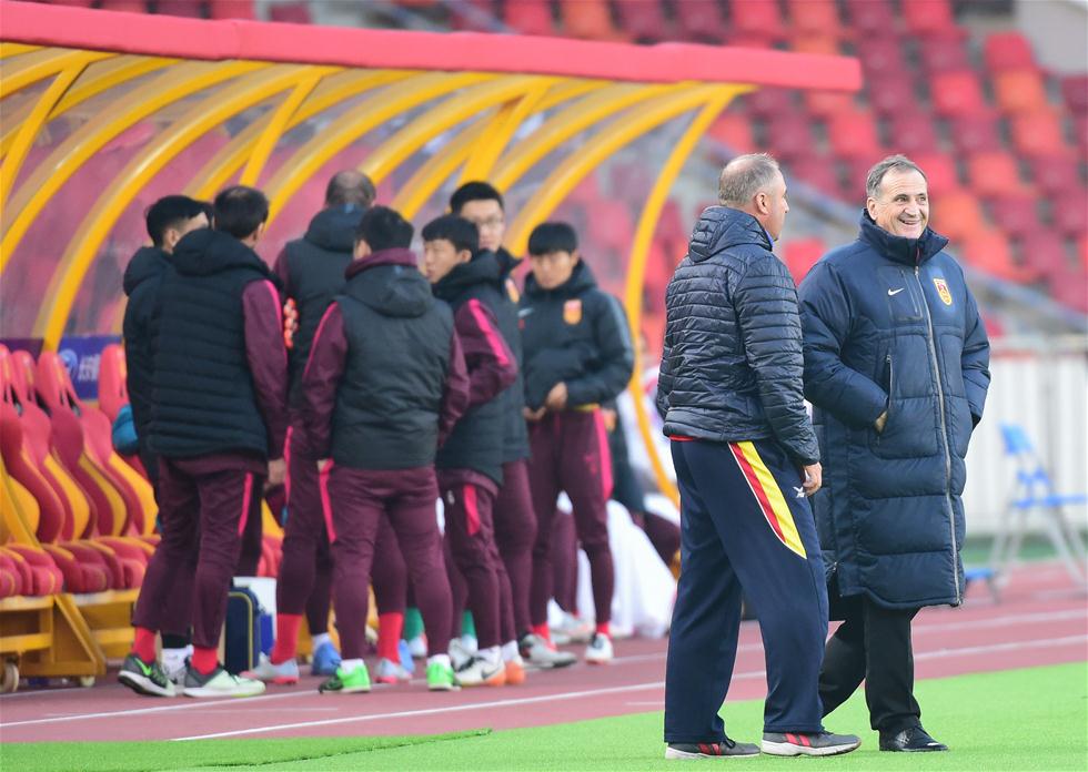 1月21日,中国队主教练布鲁诺·比尼(右一)赛后和缅甸队主教练雷内尔·胡伯图斯交流。当日,在2017年“春辉物流杯”中国足协佛山国际女足锦标赛中,中国队以2比0战胜缅甸队。 新华社记者刘大伟摄
