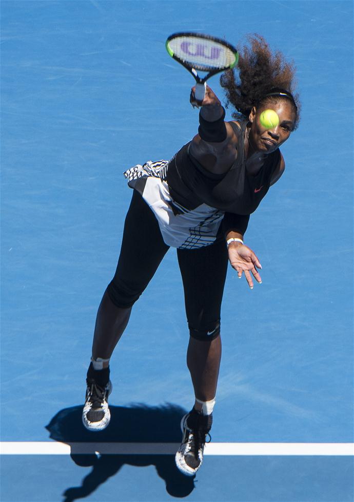 1月25日,美国选手塞雷纳·威廉姆斯在比赛中发球。当日,在2017年澳大利亚网球公开赛女子单打四分之一决赛中,美国选手塞雷纳·威廉姆斯以2比0战胜英国选手孔塔,晋级四强。新华社记者吕小炜摄