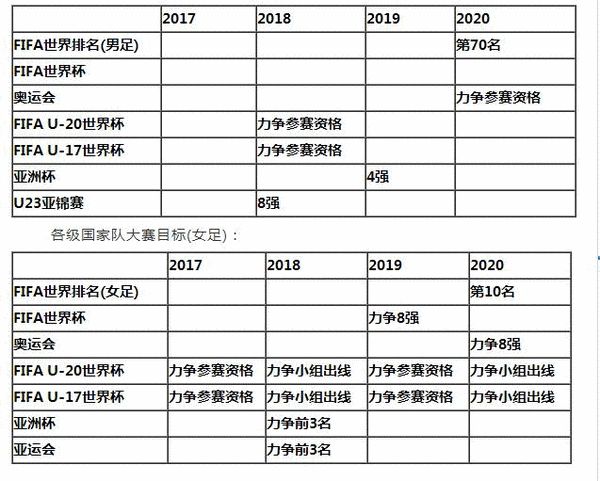 此外,计划还公布了各级国家队大赛目标(男足):