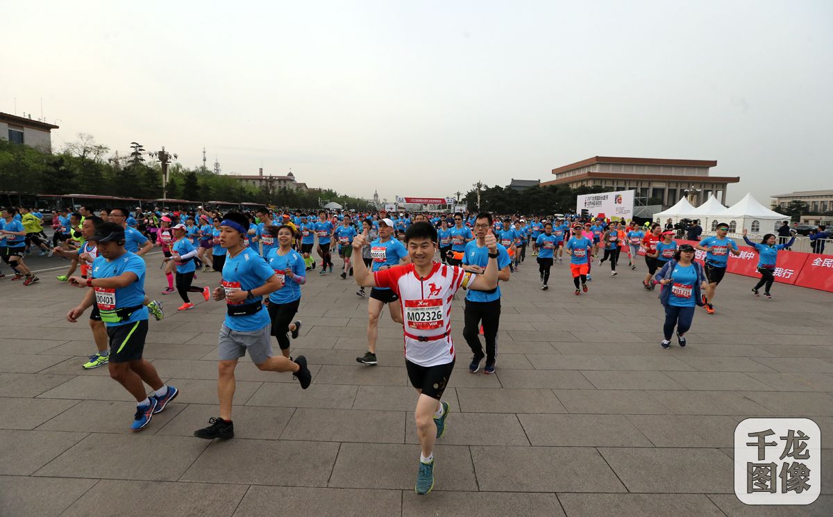 4月16日,2017北京国际长跑节暨北京半程马拉松在天安门广场鸣枪起跑。图为北京半程马拉松鸣枪两万余名跑者欢乐开跑。千龙网记者 戚连民摄