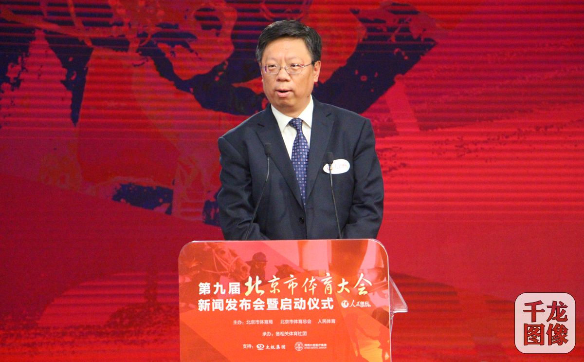 5月4日,第九届北京市体育大会新闻发布暨启动仪式在京举行。图为北京市体育局副局长、北京市体育总会副主席杨海滨(右二)出席启动仪式并致辞。千龙网发 胡宗洋摄