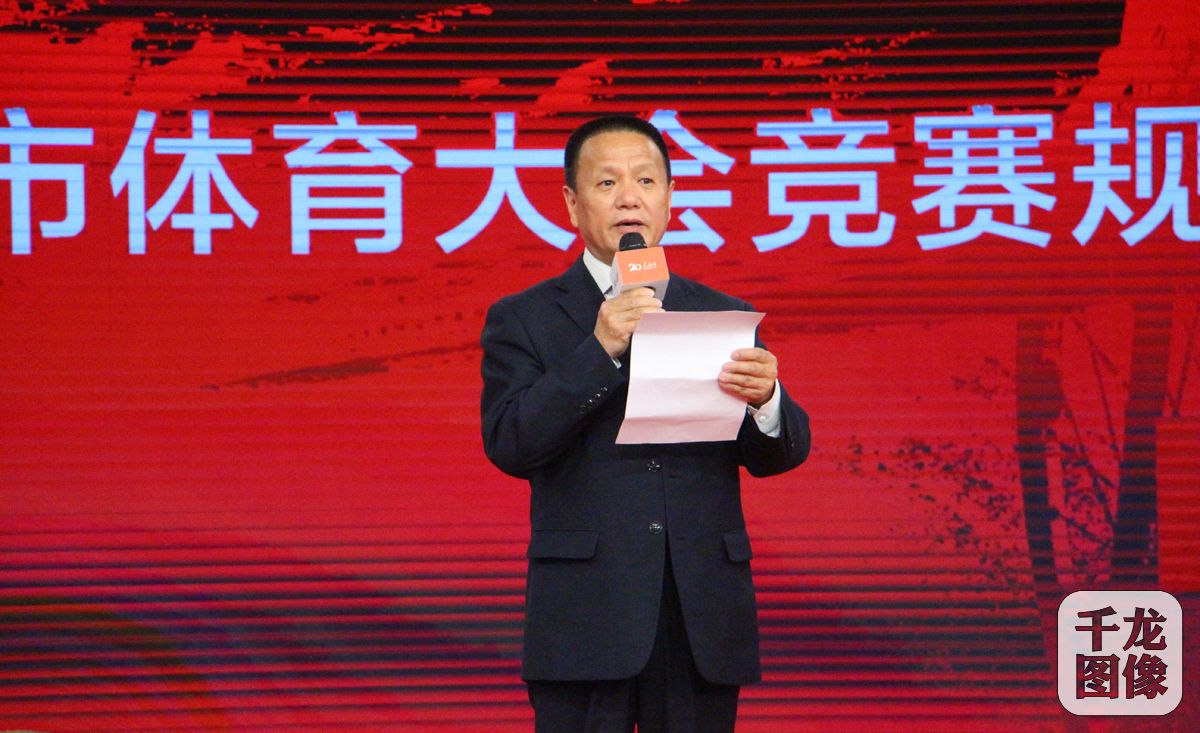 5月4日,第九届北京市体育大会新闻发布暨启动仪式在京举行。图为北京体育总会秘书长王品熙进行竞赛规程发布。千龙网发 胡宗洋摄