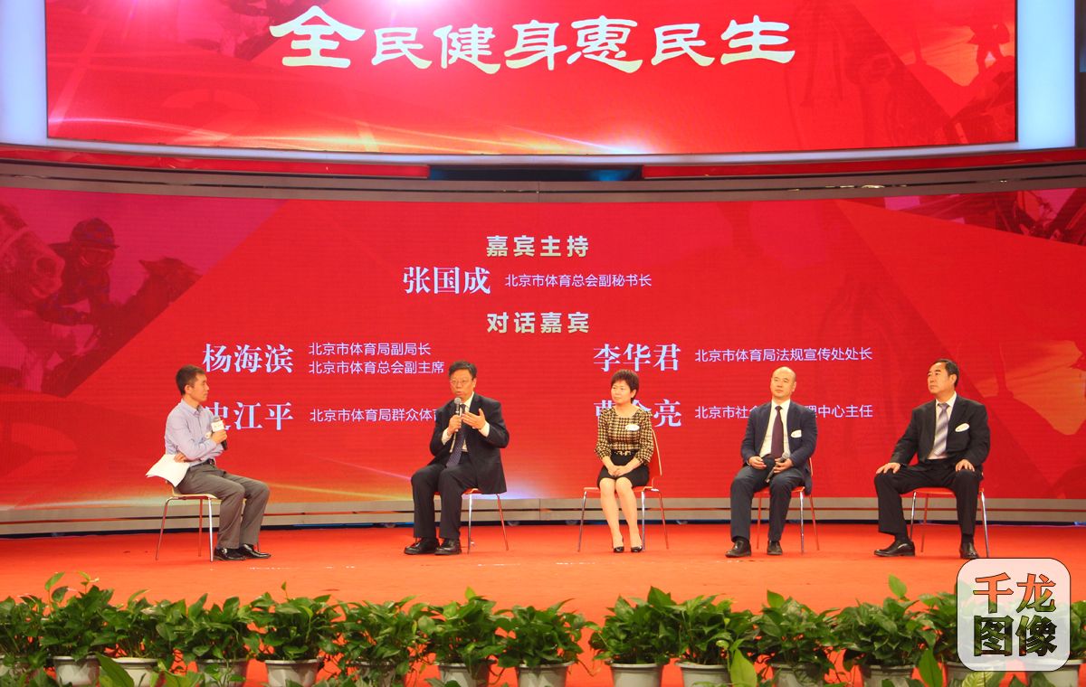 5月4日,第九届北京市体育大会新闻发布暨启动仪式在京举行。图为以“全民健身惠民生”为主题的嘉宾论坛,多位嘉宾就如何更好地开展全民健身活动,让广大老百姓共享体育改革发展的成果展开对话。千龙网发 胡宗洋摄