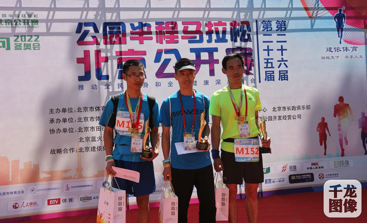 5月6日,跑向2022冬奥会·第25届、第26届公园半程马拉松北京公开赛在北京朝阳公园成功举办。图为男子前三名合影。千龙网记者 戚连民摄