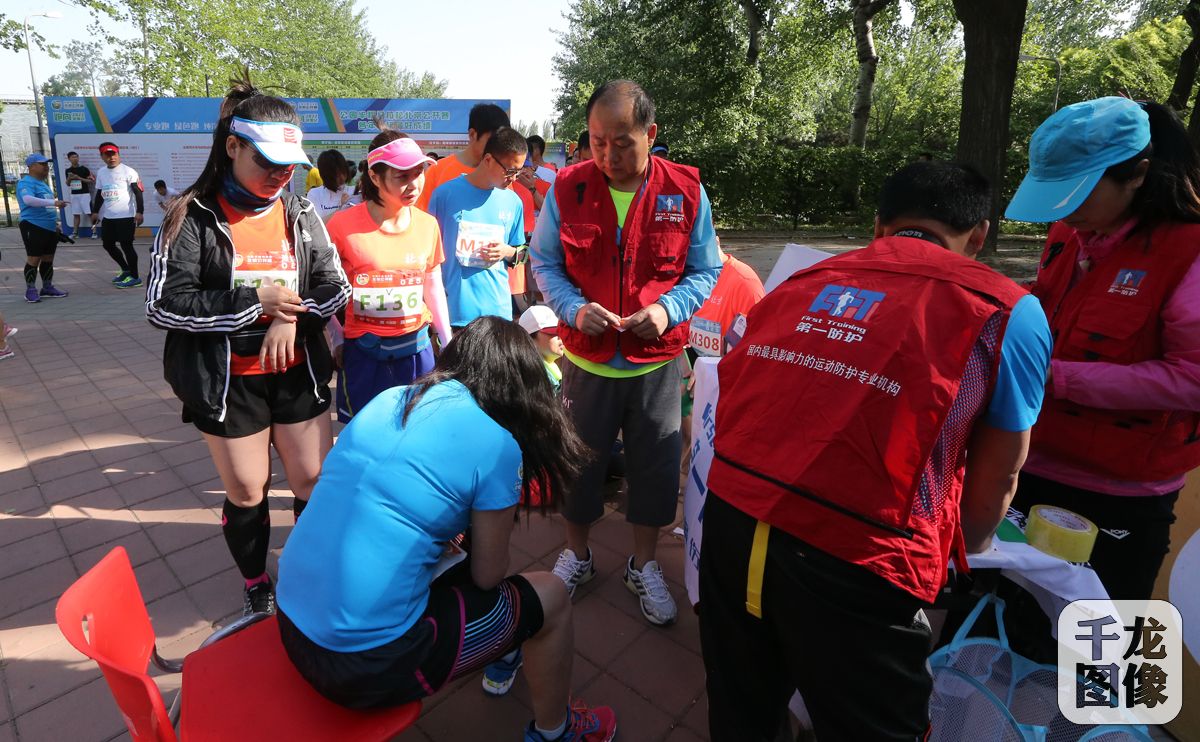 5月6日,跑向2022冬奥会·第25届、第26届公园半程马拉松北京公开赛在北京朝阳公园成功举办。图为第一防护的专业教练为选手赛前做防护。千龙网记者 戚连民摄