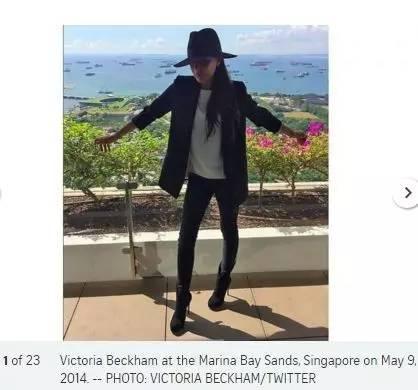 ▲维多利亚。贝克汉姆2014年在新加坡滨海湾金沙酒店。(图据《海峡时报》)