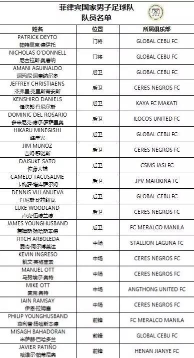 5月30日晚,菲律宾国家队主帅托马斯·杜里公布了来华参赛的21人大名单。在广州踢完与中国男足的热身赛之后,菲律宾国家队还将前往杜尚别,迎来与塔吉克斯坦的亚洲杯预选赛。