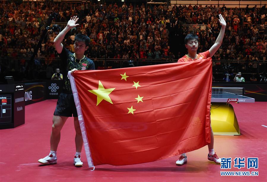 6月5日,马龙(右)和樊振东在比赛后向观众致意。当日,在德国杜塞尔多夫举行的2017年世界乒乓球锦标赛男单决赛中,中国选手马龙以4比3战胜队友樊振东,获得冠军。 新华社记者 陶希夷 摄