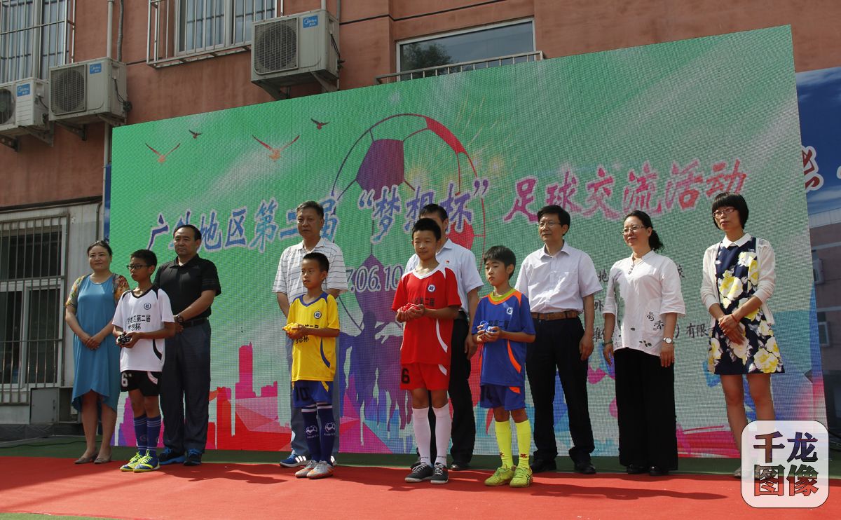 6月10日,2017广外地区“梦想杯”青少年校园足球交流活动在椿树馆小学举行,活动旨在以足球为载体,培养学生的团队合作精神,锻炼他们坚韧不拔的意志品质。图为与会领导为四所学校赠送运动腕带。千龙网发 主办方供图
