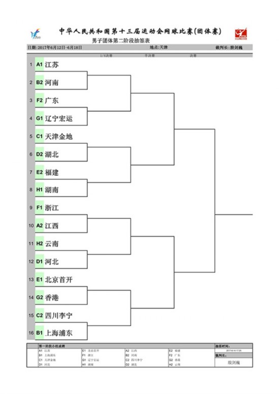 14日下午,赛事组委会在天津网球中心举行了淘汰赛抽签仪式。本次抽签首先将各组第一经过抽签选入相应签位,然后各小组第二秉承同组回避不同区的原则进行抽签。经过抽签,男子团体赛的大热门江苏队将迎接河南队的挑战,女子团体的卫冕冠军天津队将迎战广东队。