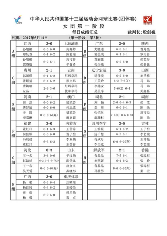 14日,小组赛最后一轮比赛全面收官。最终男子团体成绩如下:江西3-0内蒙古,河南2-1山西,四川2-1广西,湖北2-1安徽,福建2-1重庆,广东3-0解放军,山东1-2辽宁,云南1-2湖南,澳门0-3贵州。女子团队成绩如下:江西3-0上海,广东3-0陕西,贵州2-1云南,辽宁3-0山西,河南2-1澳门,湖北2-1湖南,福建3-0内蒙古,四川3-0吉林,河北0-3山东,解放军2-1香港,广西3-0重庆。