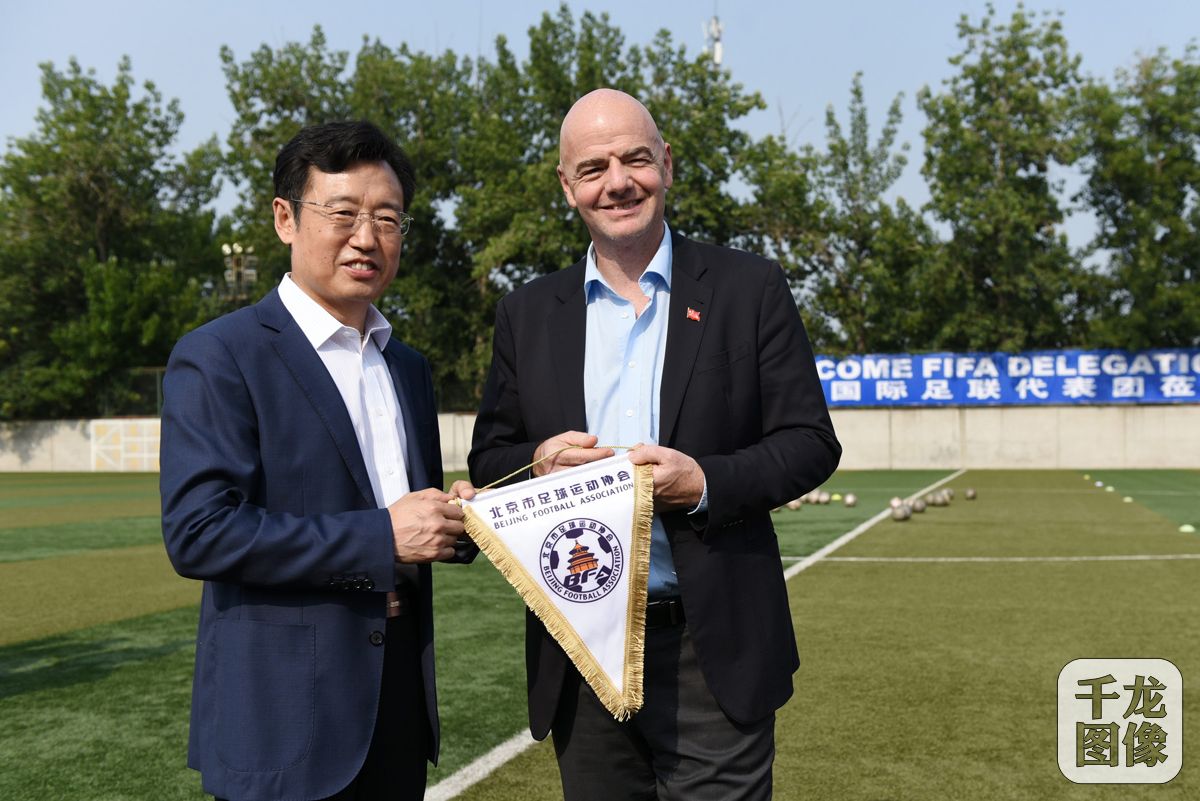6月13日,国际足联主席詹尼·因凡蒂诺携代表团莅临北京市先农坛体育场,观看北京市青少年足球训练。图为中国足协执委、市体育局局长、市足协执行主席孙学才和国际足联主席詹尼·因凡蒂诺互换礼物。千龙网发 市足协供图