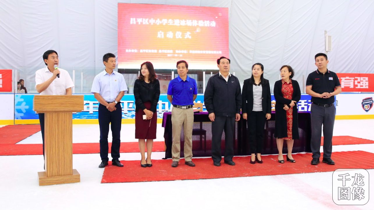6月15日,2017年昌平区中小学生进冰场体验活动启动仪式在华星冰上运动中心沙河馆举行。图为参加活动的领导和嘉宾。千龙网发 主办方供图