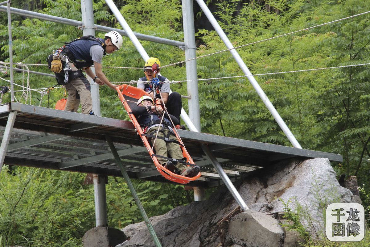 6月14日—15日,2017年全国山地救援交流赛在浙江省桐庐县瑶琳镇纪龙山神仙峰举办。图为来自全国各地的山地救援队伍提供交流技术、交换经验、切磋技艺。千龙网发 登山协会供图