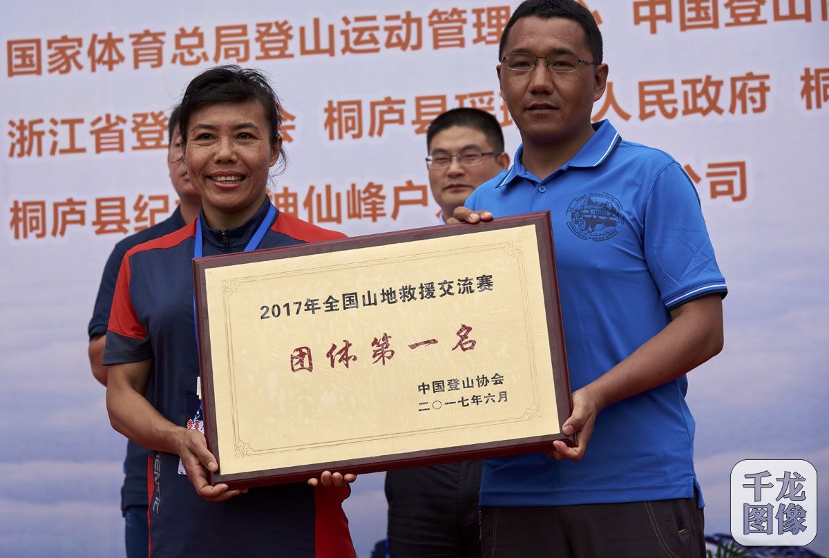 6月14日—15日,2017年全国山地救援交流赛在浙江省桐庐县瑶琳镇纪龙山神仙峰举办。图为国家体育总局登山运动管理中心高山探险部主任次落为获奖队伍颁奖。千龙网发 登山协会供图