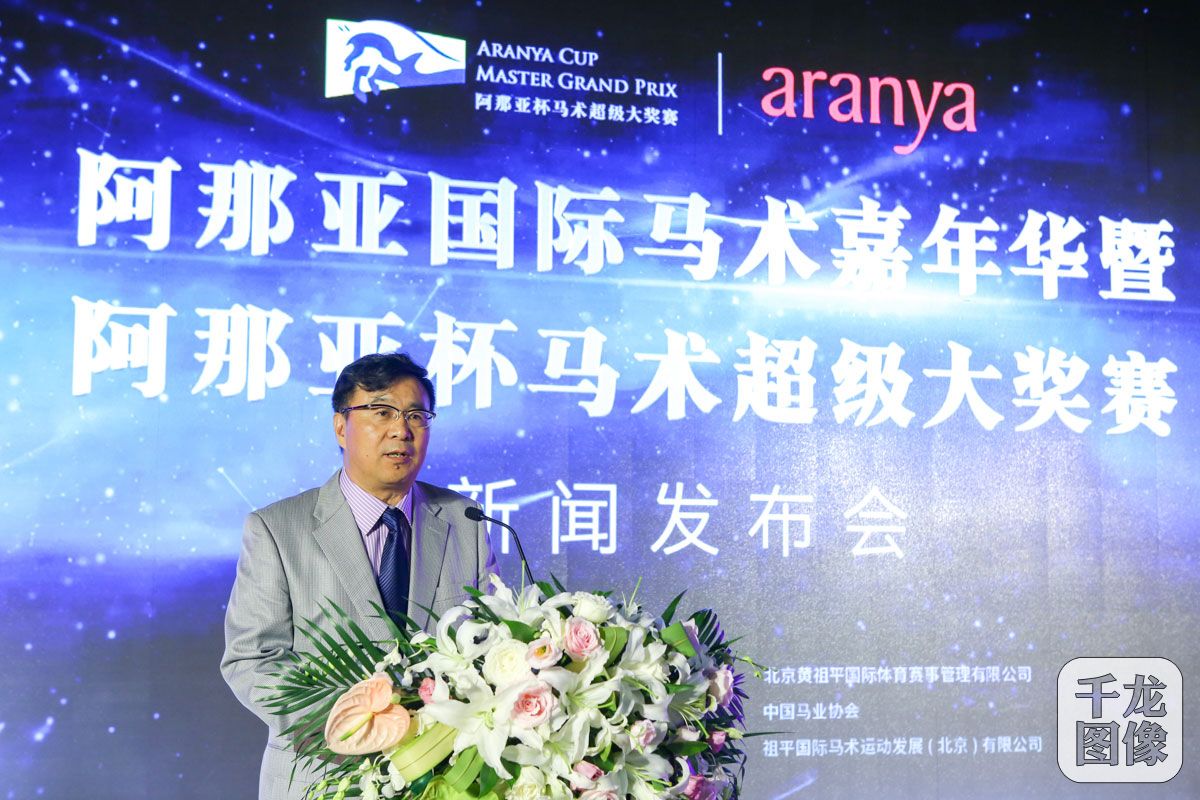6月21日,2017阿那亚国际马术嘉年华暨阿那亚杯马术超级大奖赛新闻发布会在秦皇岛举办。图为天行九州集团董事长刘昕致辞。千龙网发 主办方供图