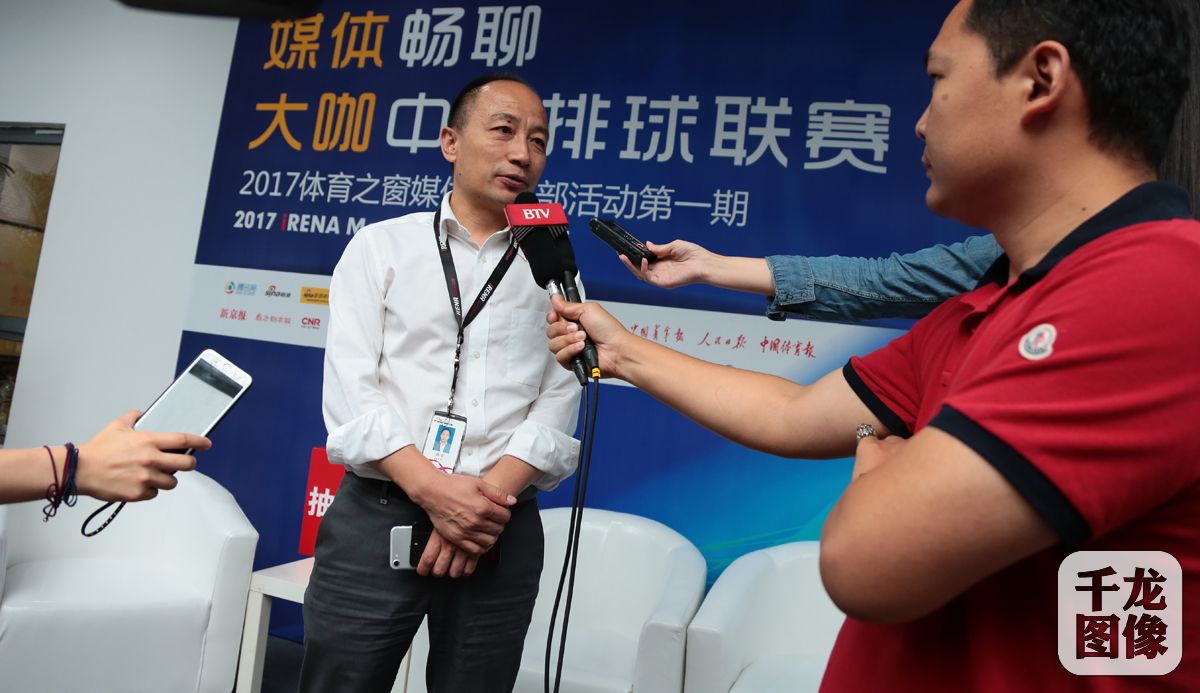 6月22日,“媒体大咖畅聊中国排球联赛”主题论坛活动在京举行,40余位资深排球记者共话排球联赛改革与发展。活动伊始,体育之窗CEO高宏先生首先向冒雨前来的嘉宾、记者表示欢迎和感谢。高宏表示,公司创办体育之窗媒体俱乐部,旨在搭建一个媒体和企业间的交流合作平台,打造业界权威的“智囊团”,共同推动中国排球联赛和体育产业发展。“众所周知,中国人有着浓厚的排球情结,而排球联赛既是男女排国家队的基础,也是国家排球战略的重要组成部分。现阶段中国女排已是世界冠军,中国男排也在崛起,我们希望通过排球联赛的产业化运营,进一步助力国家队。”高宏说。图为高宏接受记者采访。千龙网发 纪晨摄
