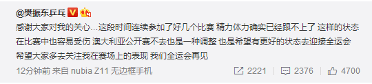 樊振东发微博说:“感谢大家对我的关心…这段时间连续参加了好几个比赛,精力体力确实已经跟不上了。这样的状态在比赛中也容易受伤,澳大利亚公开赛不去也是一种调整,也是希望有更好的状态去迎接全运会,希望大家多去关注我在赛场上的表现,我们全运会再见。”