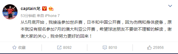 队长马龙说:“从5月底开始,我接连参加世乒赛,日本和中国公开赛,因为伤病和身体疲惫,原本就没有报名参加7月的澳大利亚公开赛,希望球迷朋友不要做不理智的解读,谢谢大家的关心,我会努力更好的回来! ”