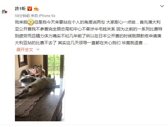 许昕说:“我来啦。但是我今天来要站在个人的角度说两句。大家耐心一点哈…首先澳大利亚公开赛我不参赛完全跟总局和中心不牵涉半毛钱关系。因为之前的一系列比赛特别疲劳而且精力体力确实不如几年前了所以在日本公开赛的时候就跟教练申请澳大利亚站的比赛不去了。其实这几天领导一直都在关心我们,毕竟就退赛的举措的确是做错了呀…希望大家能够客观分析问题。昕哥不小了,打完大赛想休息一下,可以吗?你们再闹就属于绑架我的自由了啊。疲劳驾驶都不可以疲劳比赛你们觉得呢?”