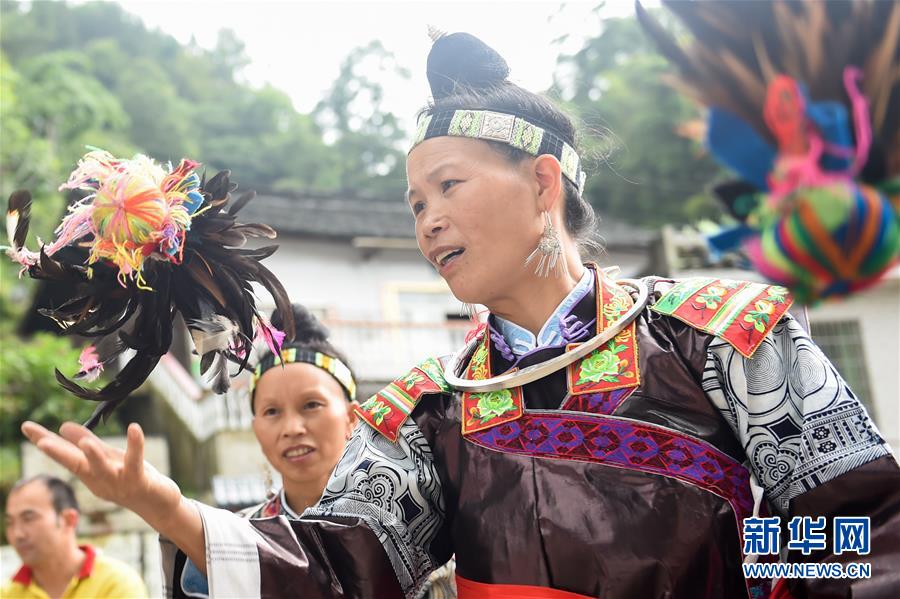 7月12日,贵州省丹寨县龙泉镇高寨村的水族村民准备进行打手毽活动。