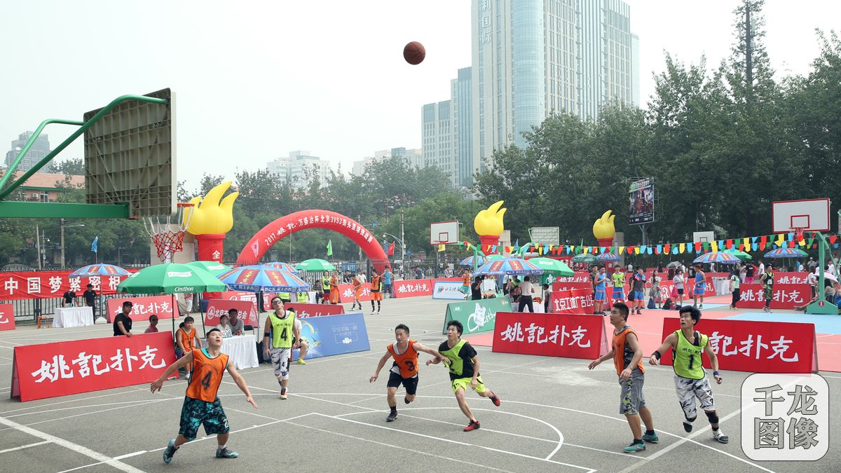 7月15日-16日,北京市第十一届全民健身体育节系列活动,2017“姚记·万盛达”杯北京3VS3街头篮球挑战赛在北京工人体育馆北广场举行。图为比赛现场。千龙网发 潘钟鸣摄