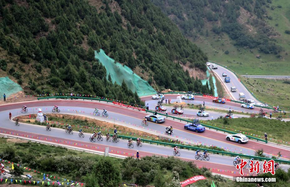 7月23日,2017第十六届环青海湖国际公路自行车赛进行了本届环湖赛青海境内最后一个完整赛段,第八赛段门源至平安的比赛。图为选手艰难骑行十二盘坡。 中新网记者 翟璐 摄
