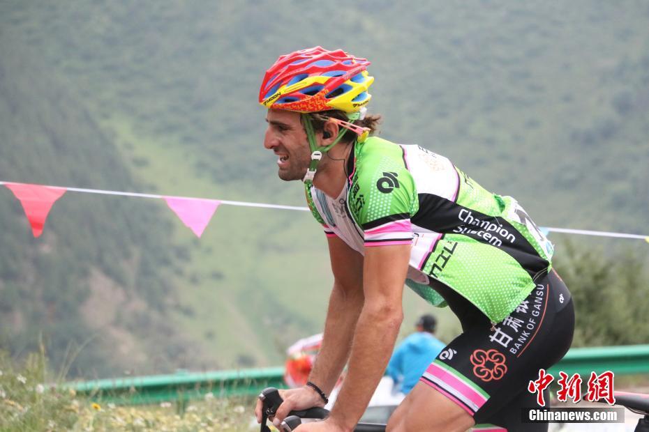 第八赛段是本届环湖赛最为艰苦的赛段之一,不仅在比赛里程上达到了前八个赛段的最长距离,海拔3282米的H级爬坡点对选手们也是一个极大的考验。因此本赛段的比赛成绩对最终的赛事成绩也将有很大影响。图为选手艰难爬坡。 中新网记者 翟璐 摄