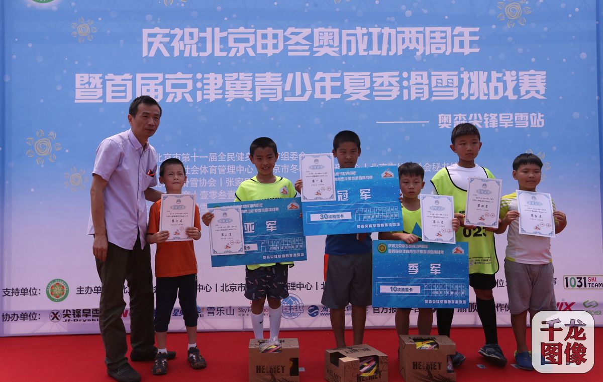 7月31日,首届京津冀青少年夏季滑雪挑战赛在北京奥林匹克森林公园尖锋旱雪四季滑雪场举行,比赛设四个组别,100名青少年选手报名参赛。图为北京市冬季运动管理中心副主任、北京市滑雪协会主席李晓鸣(左一)为获奖选手颁奖。千龙网记者 戚连民摄