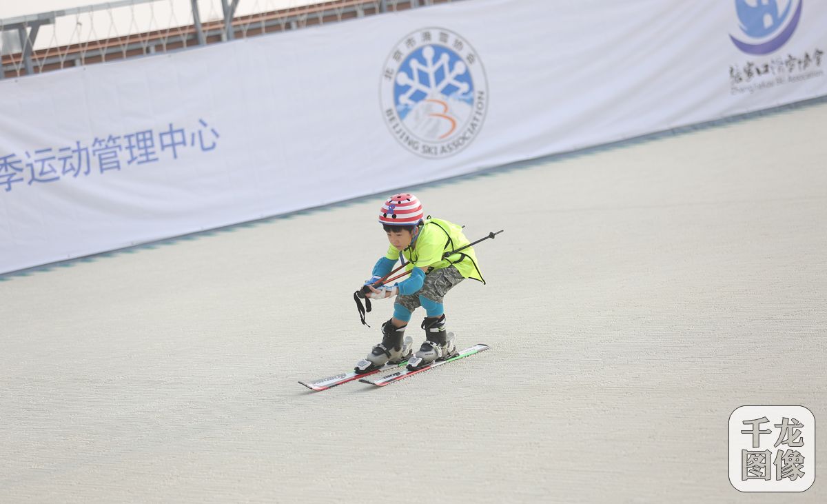 7月31日,首届京津冀青少年夏季滑雪挑战赛在北京奥林匹克森林公园尖锋旱雪四季滑雪场举行,比赛设四个组别,100名青少年选手报名参赛。图为参赛小选手在比赛中。千龙网发 主办方供图