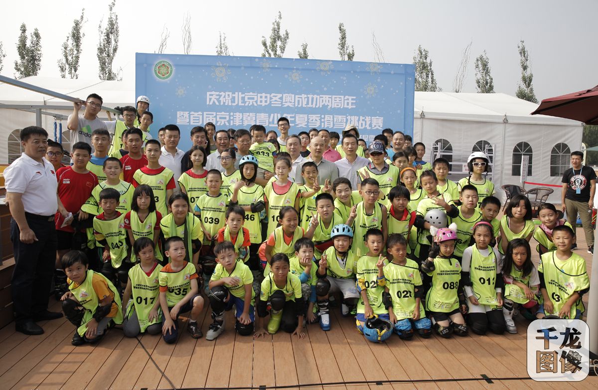7月31日,首届京津冀青少年夏季滑雪挑战赛在北京奥林匹克森林公园尖锋旱雪四季滑雪场举行,比赛设四个组别,100名青少年选手报名参赛。图为领导嘉宾和小选手合影。千龙网发 主办方供图