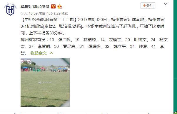 8月20日,据网友爆料,中甲预备队第22轮,梅州客家与杭州绿城的比赛,由于主裁判赶飞机,本场比赛被压缩至1小时。