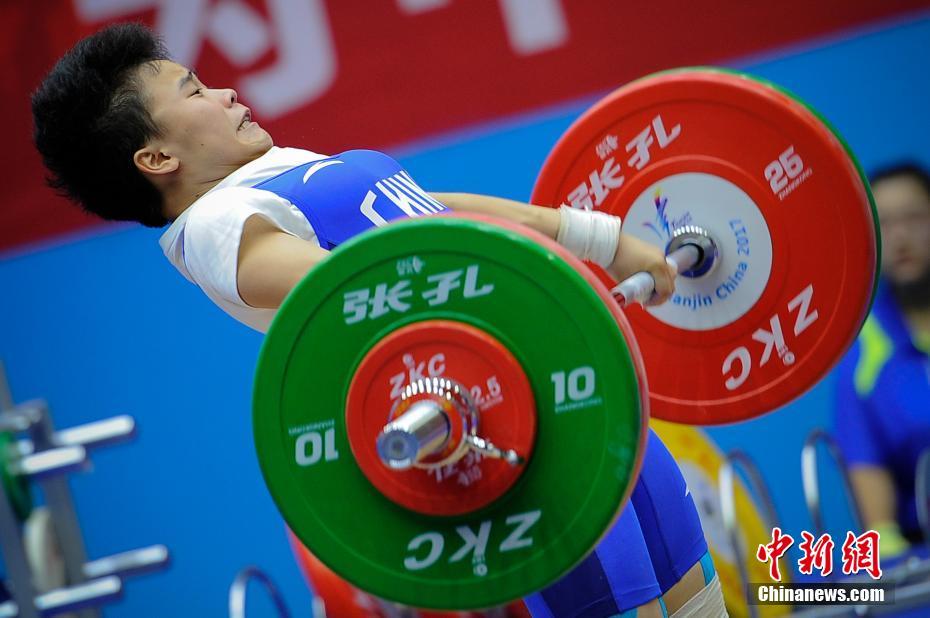 8月28日下午,第十三届全运会举重比赛首个决赛项目女子48公斤级的争夺在天津市滨海新区大港体育馆进行。最终,湖南选手侯志慧以208公斤(抓举93公斤、挺举115公斤)获得总成绩冠军。中新社记者 佟郁 摄