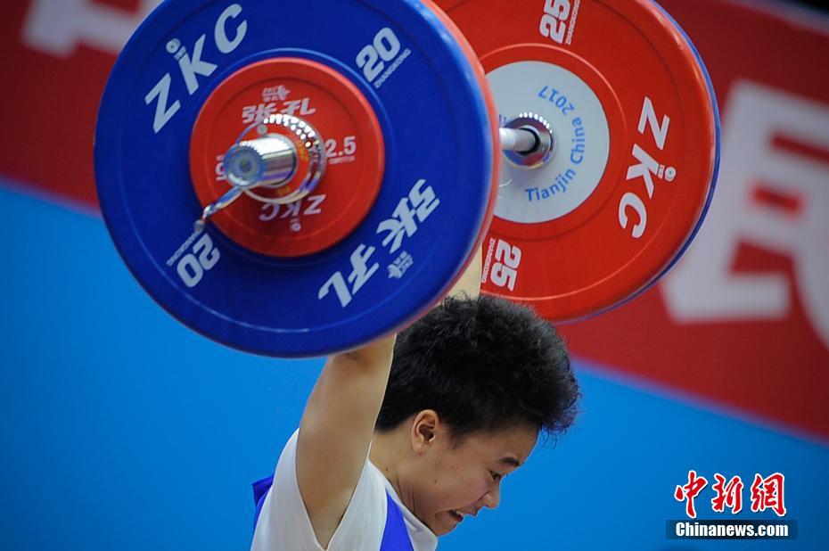 8月28日下午,第十三届全运会举重比赛首个决赛项目女子48公斤级的争夺在天津市滨海新区大港体育馆进行。最终,湖南选手侯志慧以208公斤(抓举93公斤、挺举115公斤)获得总成绩冠军。中新社记者 佟郁 摄