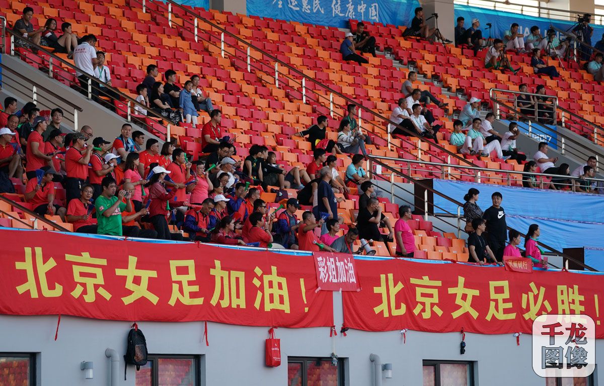 8月30日,第十三届全运会足球女子成年组第二轮比赛继续进行,在B组北京女足对河南女足的比赛中,北京女足在1-3落后的不利局面下,奋力反击,连入四球,最终以5-3逆转战胜河南女足。图为球迷为球队加油助威。千龙网记者 戚连民摄