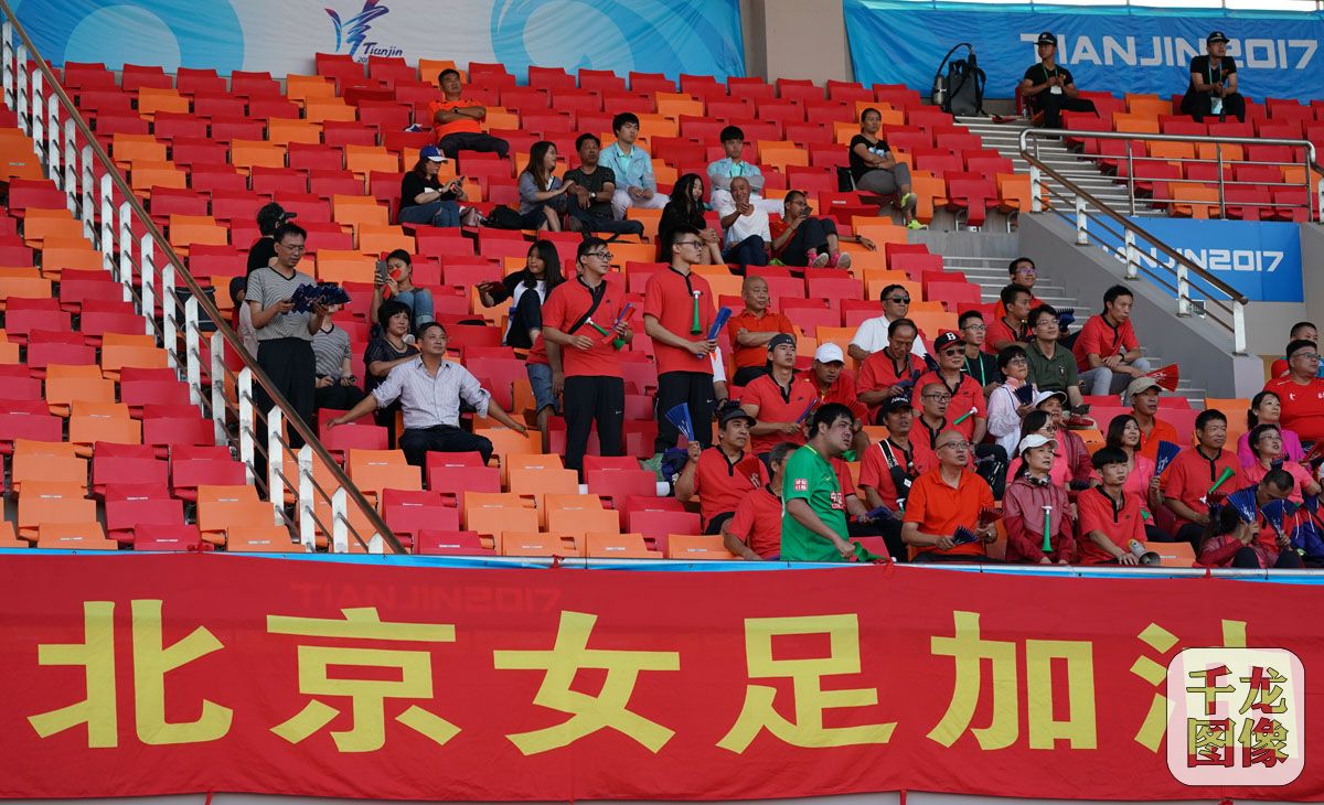8月30日,第十三届全运会足球女子成年组第二轮比赛继续进行,在B组北京女足对河南女足的比赛中,北京女足在1-3落后的不利局面下,奋力反击,连入四球,最终以5-3逆转战胜河南女足。图为球迷为球队加油助威。千龙网记者 戚连民摄