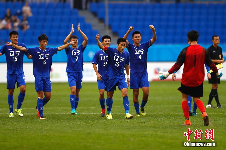 8月29日,天津全运会U20男足小组赛B组第3场在天津团泊足球场举行,在90分钟0:0战平的情况下,辽宁队(蓝)在点球大战中以4:2战胜新疆队。中新社记者 富田 摄