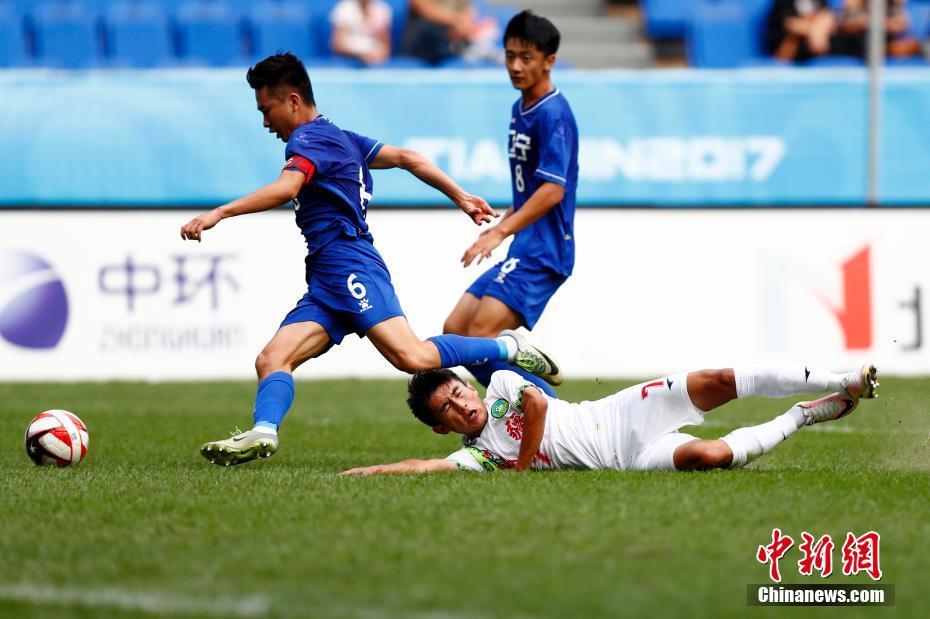 8月29日,天津全运会U20男足小组赛B组第3场在天津团泊足球场举行,在90分钟0:0战平的情况下,辽宁队(蓝)在点球大战中以4:2战胜新疆队。图为新疆队叶尔买克·塔拉甫汗在进攻中摔倒。中新社记者 富田 摄
