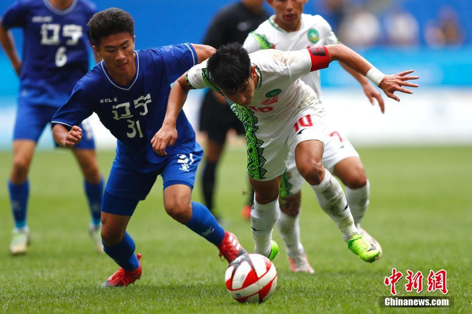 8月29日,天津全运会U20男足小组赛B组第3场在天津团泊足球场举行,在90分钟0:0战平的情况下,辽宁队(蓝)在点球大战中以4:2战胜新疆队。图为新疆队达尼亚尔·木沙江进攻。中新社记者 富田 摄