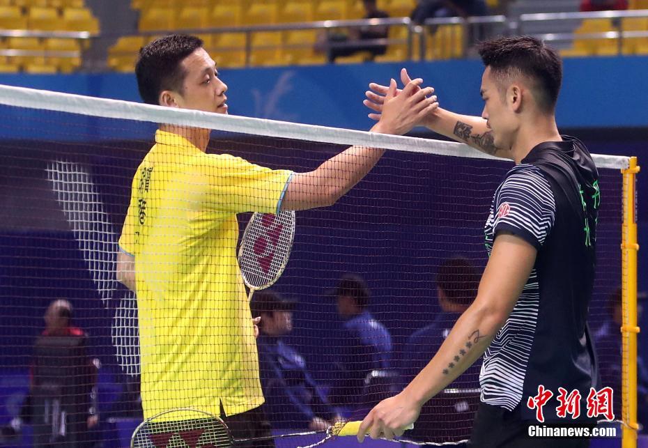 8月31日,天津全运会羽毛球男子团体比赛在宝坻区体育馆举行,北京队林丹(右)2比0胜香港队胡赟(左)。中新社记者 张宇 摄