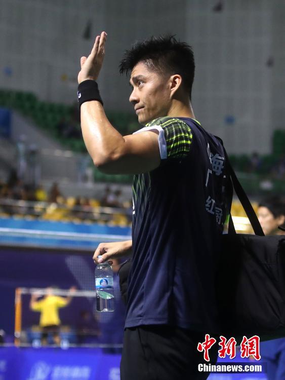 8月31日,天津全运会羽毛球男子团体比赛在宝坻区体育馆举行,广东队傅海峰参赛。中新社记者 张宇 摄
