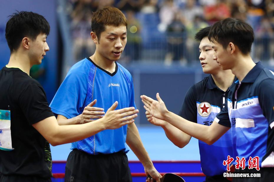 9月5日,天津全运会乒乓球男双决赛在武清体育中心体育馆举行,由周雨(右一)、樊振东(右二)组成的解放军以4:3战胜由马龙(左一)、许昕(左二)组成的京沪队,摘得金牌。图为赛后四位运动员握手致意。中新社记者 富田 摄