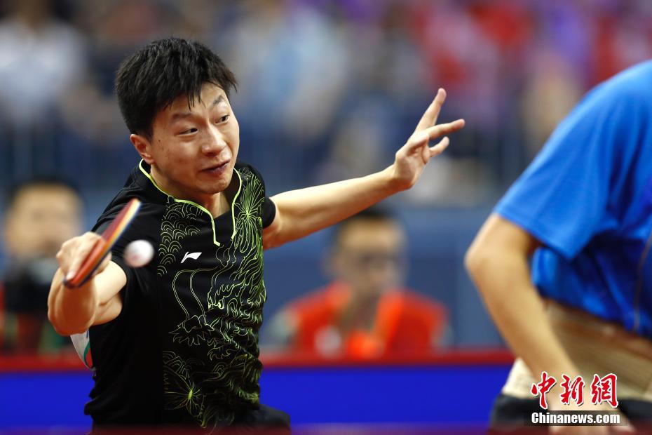 9月5日,天津全运会乒乓球男双决赛在武清体育中心体育馆举行,由马龙(左)、许昕组成的京沪队以3:4不敌由周雨、樊振东组成的解放军,摘得银牌。中新社记者 富田 摄