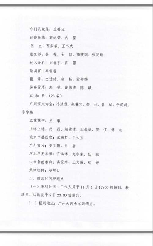 11月1日,国足公布最新一期集训名单。恒大队长郑智因伤无缘,冯潇霆领衔恒大6将在列。上港也有5名球员入选,鲁能和华夏各有3人进入大名单。11月5日,球队将在广州报到,备战同塞尔维亚队热身赛。