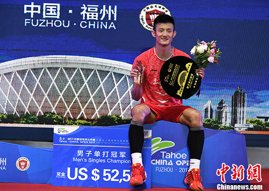 11月19日,在福州举行的2017中国羽毛球公开赛进入决赛阶段,中国选手谌龙战胜丹麦选手维克多·阿萨尔森夺得男单冠军。 中新社记者 王东明 摄