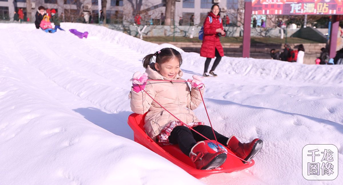 12月26日,北京市东城区第四届冰雪嘉年华活动在龙潭湖公园冰雪世界举行。图为小朋友体验滑简易雪橇的快乐。千龙网记者 戚连民摄