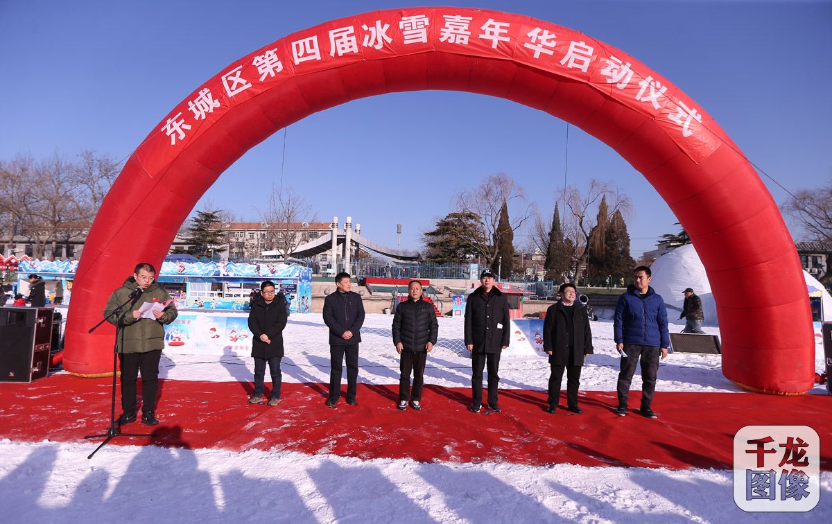 12月26日,北京市东城区第四届冰雪嘉年华活动在龙潭湖公园冰雪世界举行。图为来自北京市体育总会、北京市社会体育管理中心、东城区体育局等单位的领导和嘉宾出席启动仪式。千龙网记者 戚连民摄