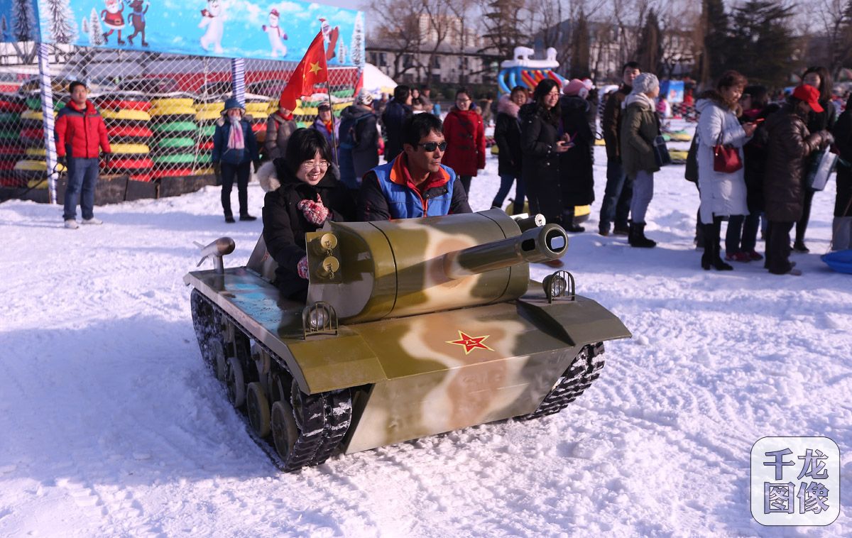12月26日,北京市东城区第四届冰雪嘉年华活动在龙潭湖公园冰雪世界举行。图为来自东城区17个街道的500名生活困难家庭的青少年和全民健身骨干志愿者体验雪地坦克。千龙网记者 戚连民摄