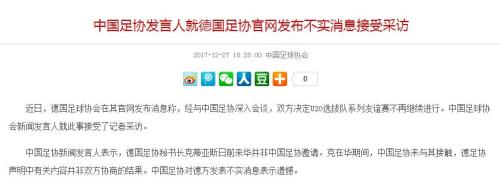 中新网12月27日电 德国足球协会发消息称,经与中国足协深入会谈,双方决定U20选拔队系列友谊赛不再继续进行。中国足协官网今天发布消息,表示对德方发表不实消息表示遗憾。