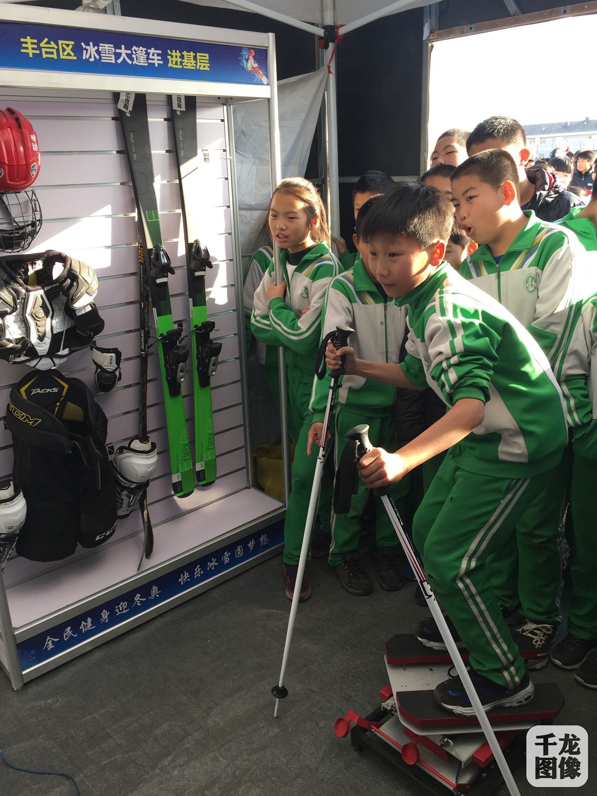1月5日,由丰台区体育局主办的“冰雪大篷车”进基层活动走进王佐镇民大附中丰台实验学校,为北京2022年冬奥会营造氛围。图为活动现场活动现场学生们体验滑雪。千龙网发 大胡摄